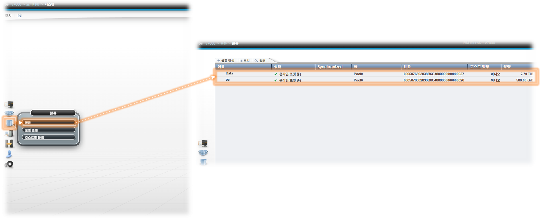 관리 콘솔에 접속하여 기존 Pool, Mdisk, Volume 정보 확인