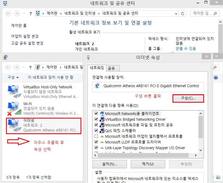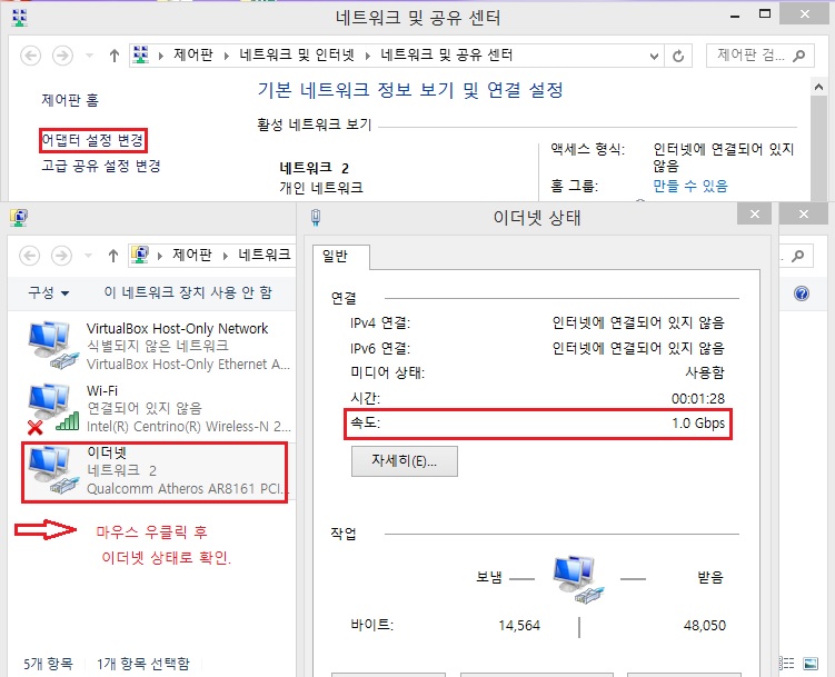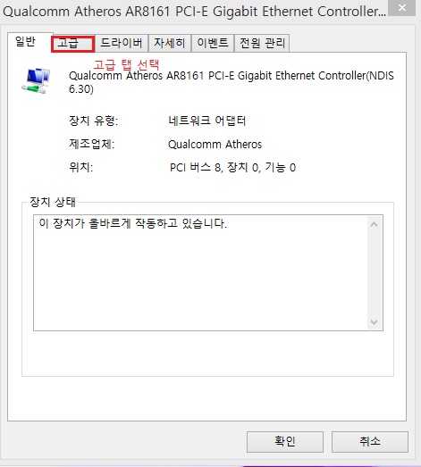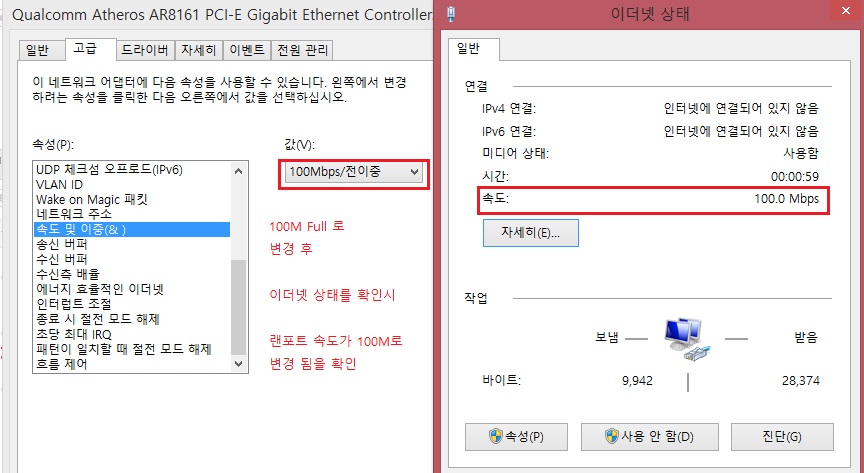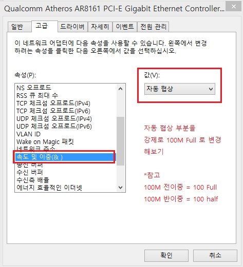 네트워크 설정 속성 ==> 해당 이더넷 인터페이스 속성 => 네트워크 구성버튼 => 고급옵션 => 전송속도 / 이중버퍼 설정 => 속도 강제조절