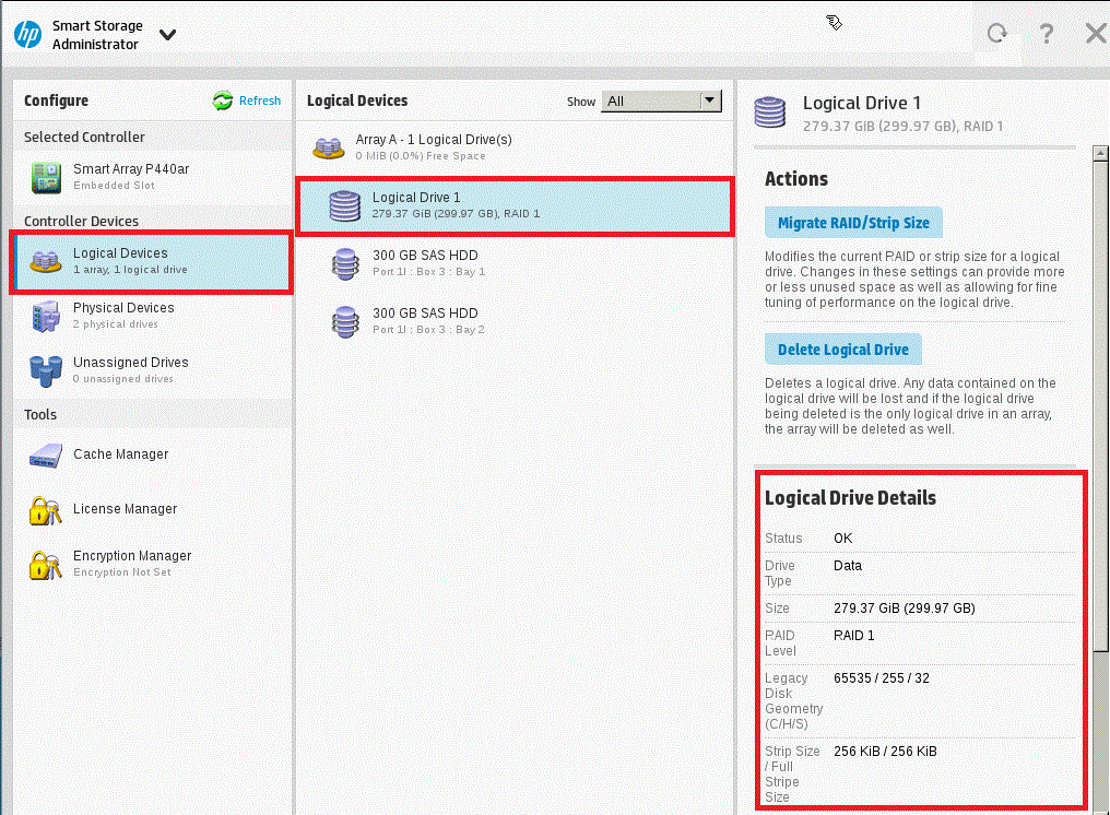 화면 우측에 Logical Drive Details 를 보고 RAID 구성 설명을 확인 할 수 있습니다.