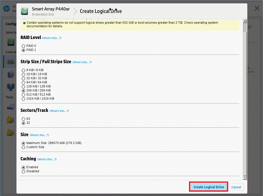 구성하는 RAID 종류 및 설정을 지정하고 Create Logical Drive 를 선택 합니다.