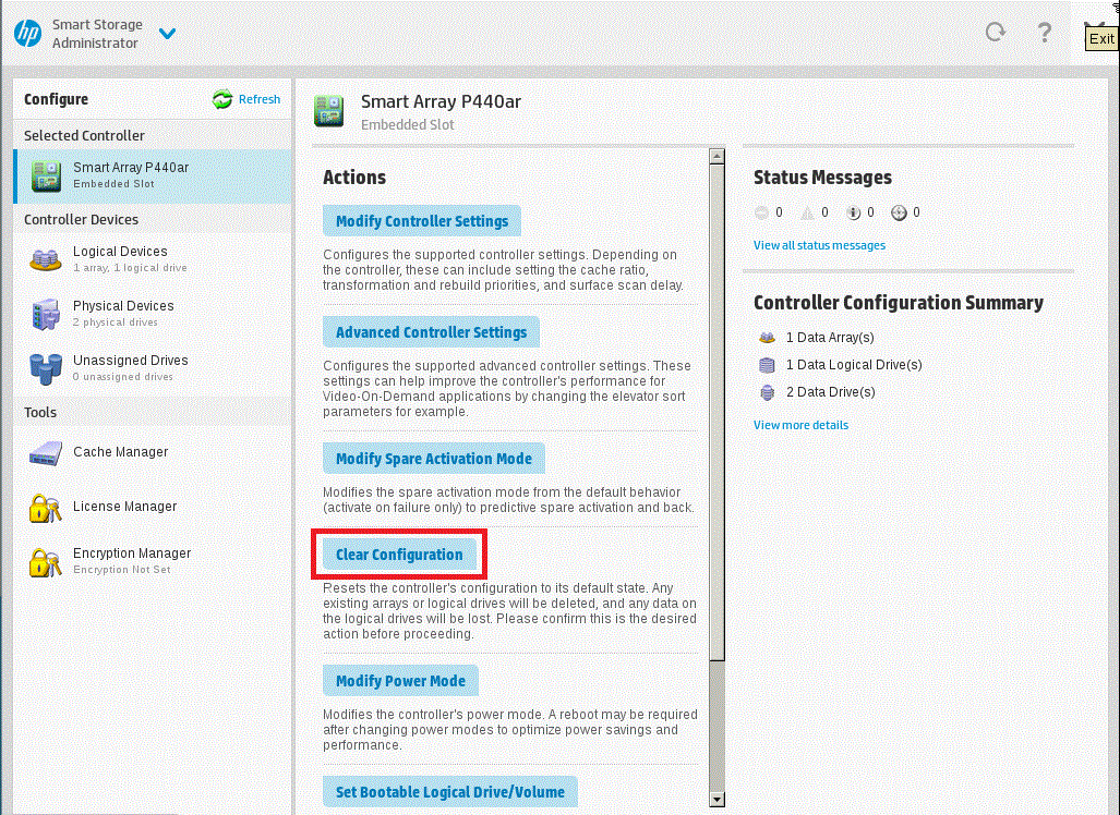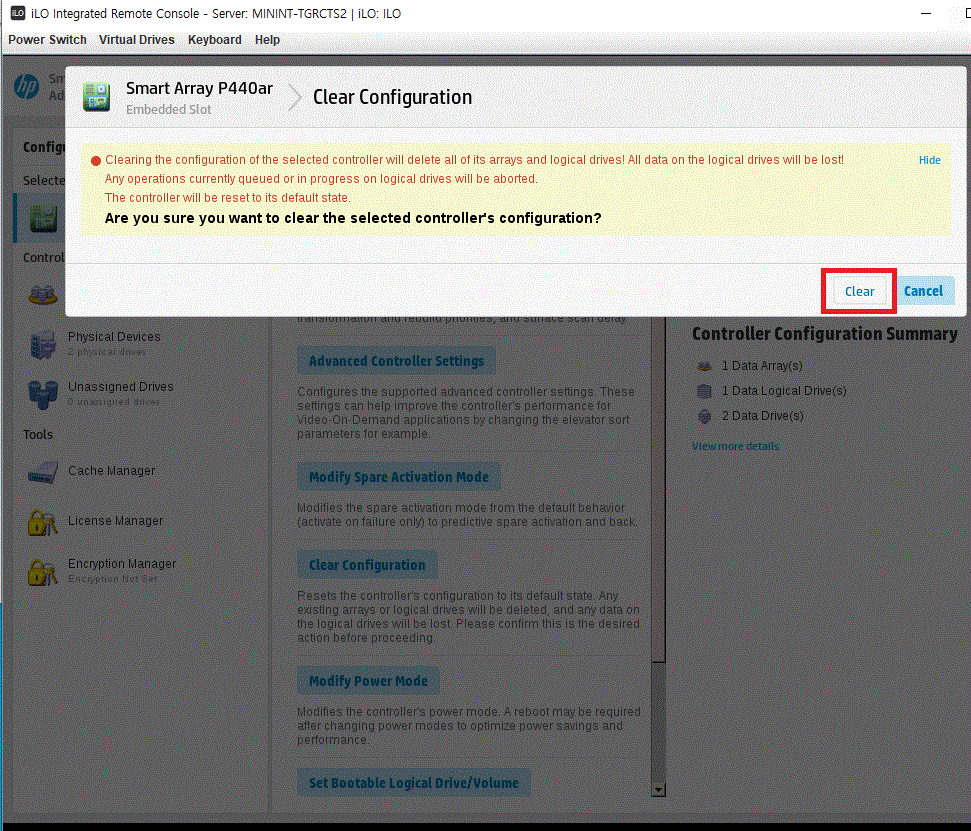 구성한 RAID를 삭제하기 위해 Clear Configuration 를 선택합니다.