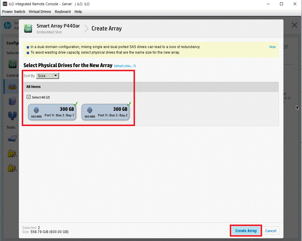RAID를 구성할 디스크를 선택하고 Create Array를 선택 합니다.