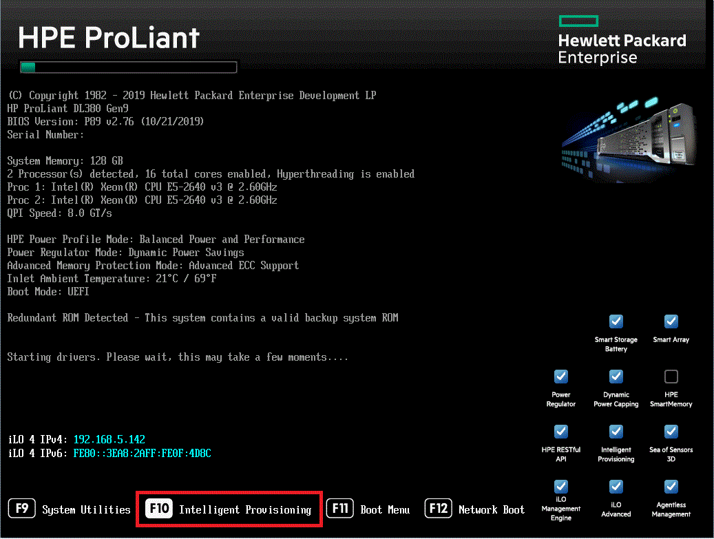 F10버튼을 눌러 Intelligent Provisioning 모드로 진입합니다.