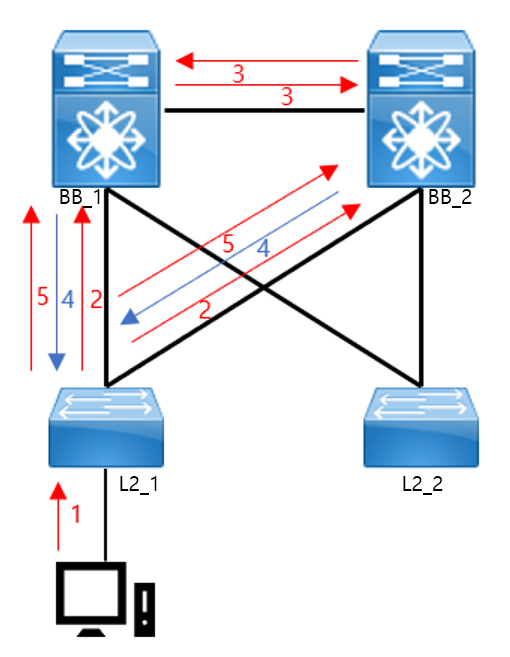 5-1. L2_1스위치에서 PC의 mac주소 정보를 BB_1에게서 다시 받게 되면 L2_1스위치는 PC의 mac 주소를 BB_1에 연결된 포트에 있다고 인식하게 되고, mac table에 PC의 mac 주소를 BB_1에 연결된 포트에 있다고 등록합니다. 그리고 해당 mac 정보를 받았던 포트를 제외한 연결된 모든 포트에 다시 전송합니다.