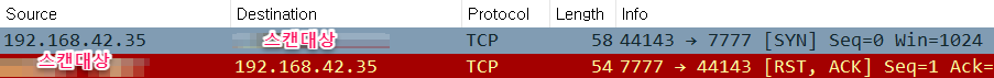 1. 열린 포트 : SYN-ACK → 공격자 RST
