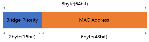Bridge ID는 기본적으로 8byte(64bit)로 이루어져 있으며 Bridge Priority(2byte)와 MAC Address(6byte)