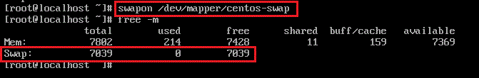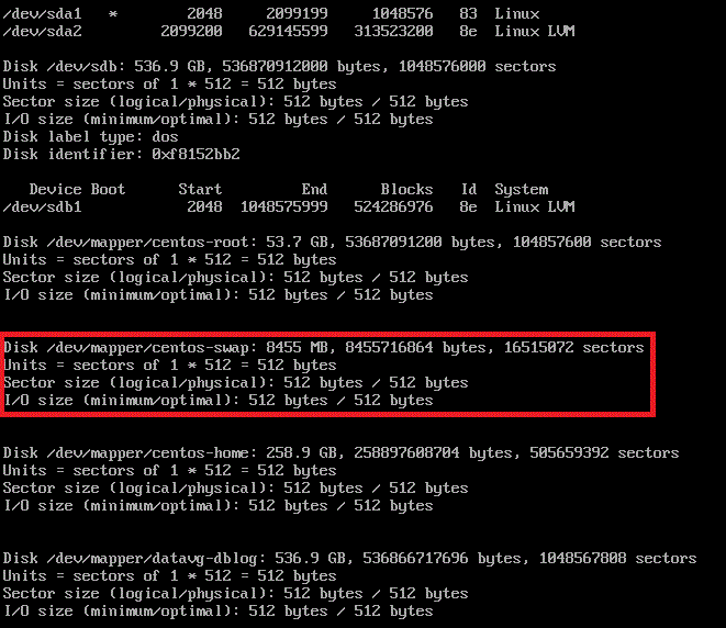 Swap 용량은 약 8G , 경로는 /dev/mapper/centos-swap 입니다.
