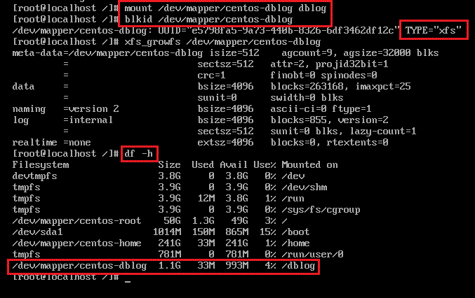 df -h 를 입력하여 dblog의 용량 확장이 잘 되있음을 확인하였습니다.