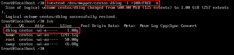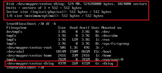 용량은 500M 이며 경로는 /dev/mapper/centos-dblog 입니다.