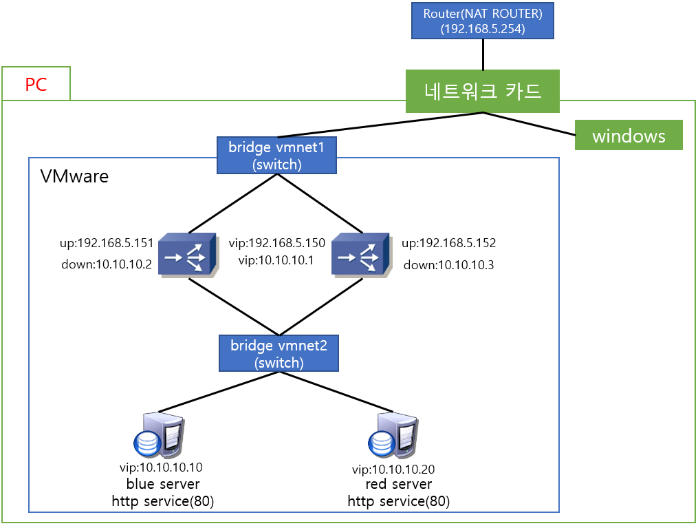 (6) VIP 10.10.10.1은 서버들의 GATEWAY 역할을 , VIP 192.168.5.150 은 서비스 IP가 될 것입니다.