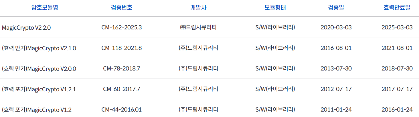 - 인증서 최하단 : 검증필 암호모듈 확인 - MagicCrypto V2.1.0