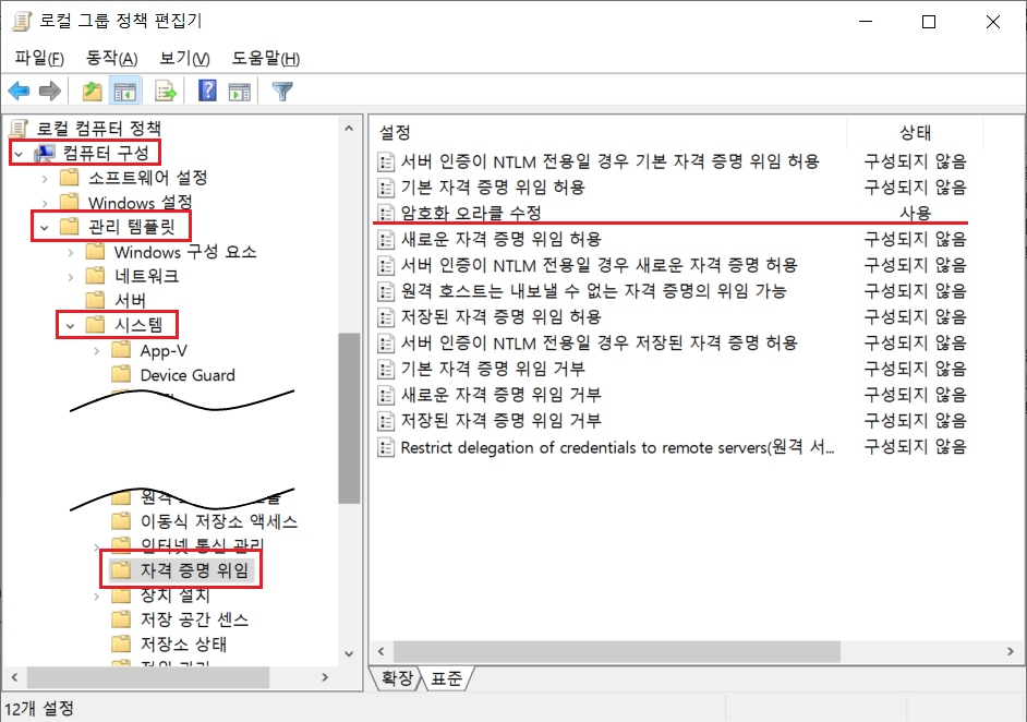 로컬 그룹 정책 편집기 창이 뜨면 "컴퓨터 구성" -> "관리 템플릿" -> "시스템" -> "자격 증명 위임"을 선택하면