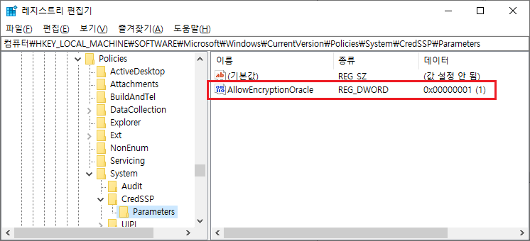 해당 경로에 가면 AllowEncryptionOracle 파일이 있고 데이터값이 (1)임을 확인할 수 있다.