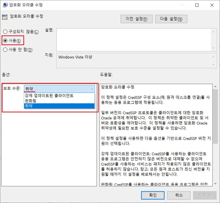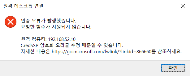 CredSSP 암호화 오라클 수정 때문일 수 있습니다." 라는 메시지 창이 뜨면서 원격 연결이 안될 때가 있다.