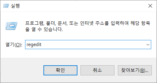 실행창을 열고 regedit을 입력하여 레지스트리 편집기를 실행한다.