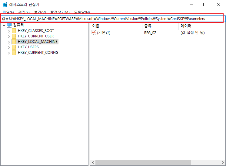 컴퓨터\HKEY_LOCAL_MACHINE\SOFTWARE\Microsoft\Windows\CurrentVersion\Policies\System\CredSSP\